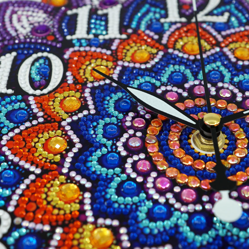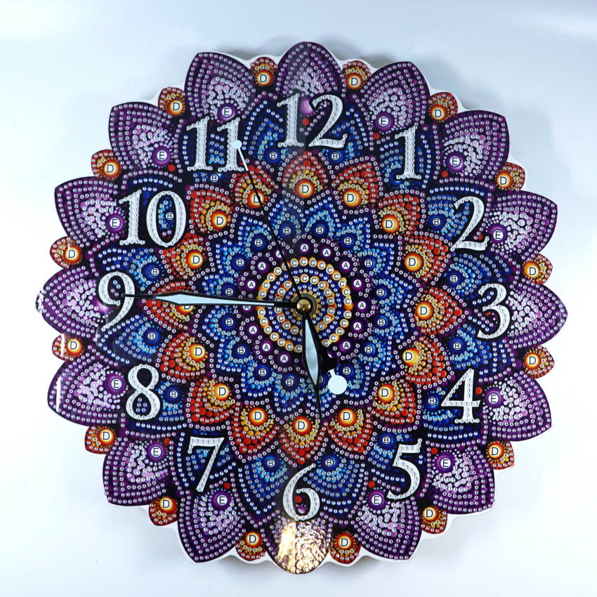 Diese edle Wanduhr aus MDF verleiht jedem Raum ein freundliches Flair. Im Zentrum prängt ein Mandala, das mit leuchtenden Strass‑, AB‑ und Sondersteinen in 13 Farben besetzt ist – im Dunkeln beginnt es an zu leuchten. Die Zeiger sind in schwarz gehalten und leuchten auch in der Nacht sodas die Zeit auch nachts gut lesbar macht.